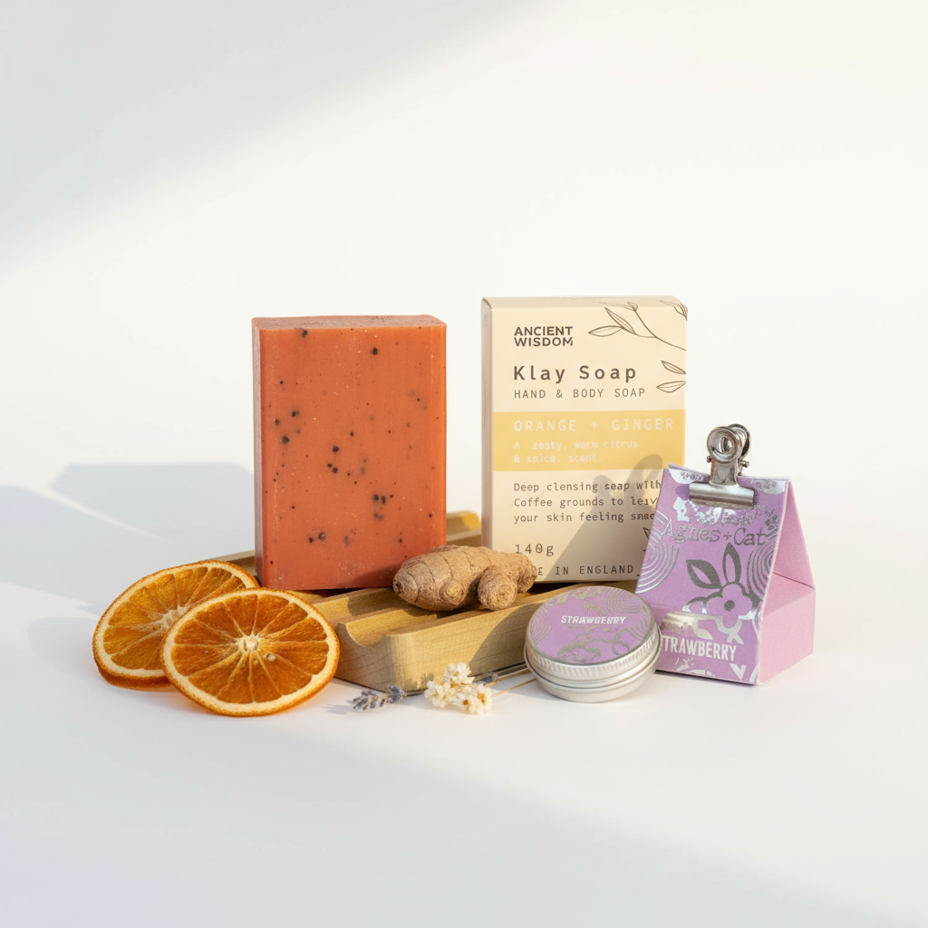 Simplifica tu rutina de cuidado diario con este kit eco-friendly esencial. Incluye todo lo que necesitas: un delicioso bálsamo labial de fresa para mantener tus labios hidratados, jabón artesanal de arcilla para limpiar tu piel de forma natural, y una elegante jabonera de madera Hemu acanalada que mantiene tus productos secos y en perfecto estado.