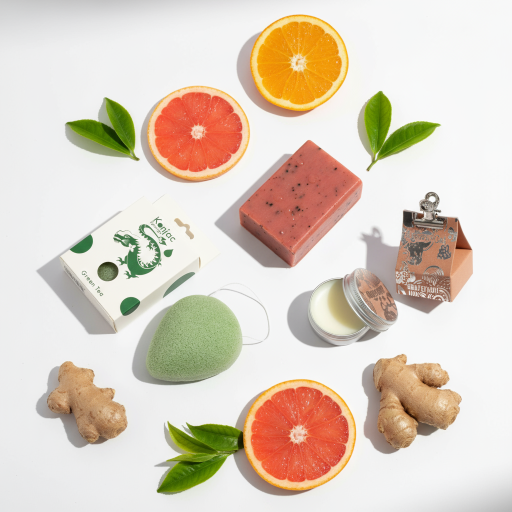 Despierta tu piel con nuestro Kit Cuidado Completo Energizante. Este pack combina tres productos naturales diseñados para revitalizar y dar energía a tu piel: un refrescante bálsamo labial de pomelo, jabón artesanal de arcilla con naranja y jengibre, y una esponja facial konjac de té verde con propiedades protectoras y antioxidantes.