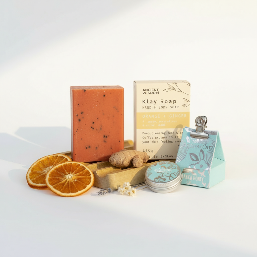 Simplifica tu rutina de cuidado diario con este kit eco-friendly esencial. Incluye todo lo que necesitas: un delicioso bálsamo labial de Miel para mantener tus labios hidratados, jabón artesanal de arcilla para limpiar tu piel de forma natural, y una elegante jabonera de madera Hemu acanalada que mantiene tus productos secos y en perfecto estado.